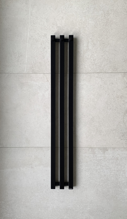 Radiátor s hranatými profily trubek. Radiátor je doplněn v horní části o hranaté háčky pro snadné zavěšení ručníků.